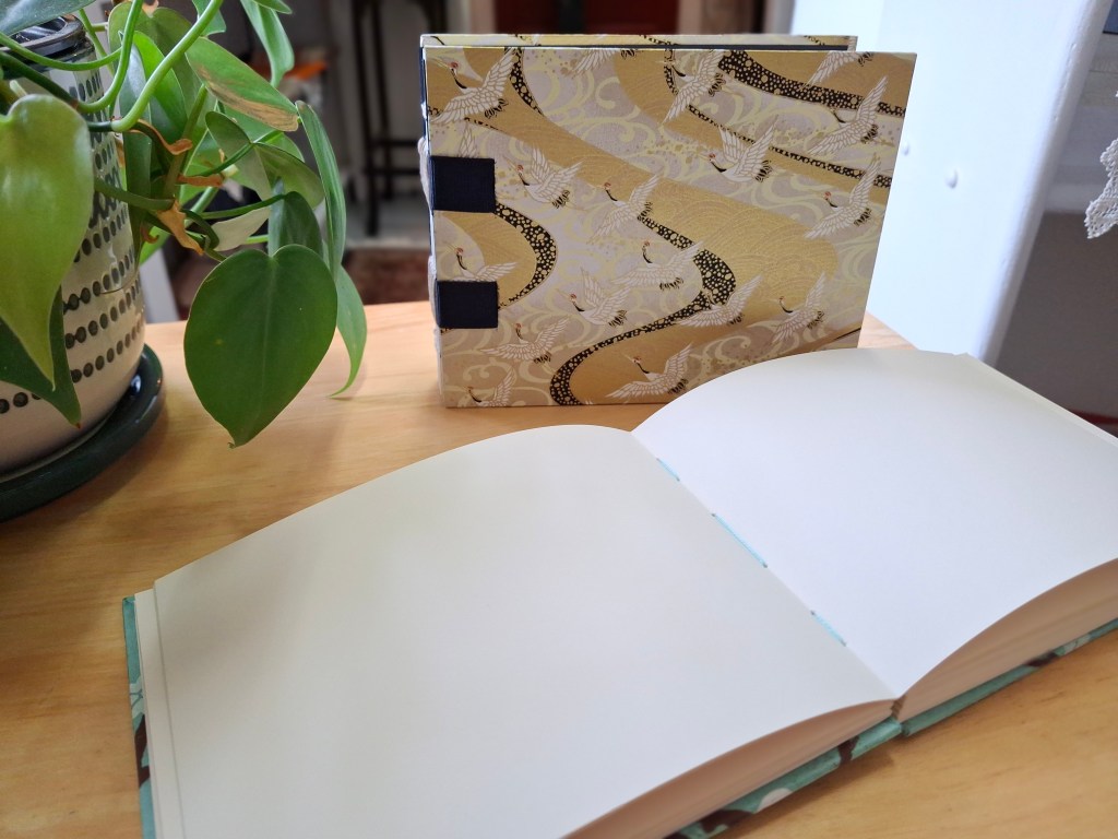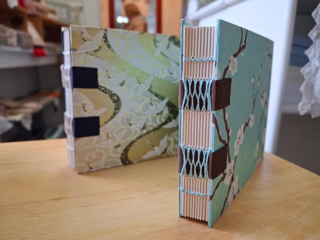 Our made-from-scratch blank journals have been popular lately! (Thank you!) We cut and fold each page by hand, stitch them together with decorative ribbon in the French-link style, then bind it all together with beautiful paper-covered boards.