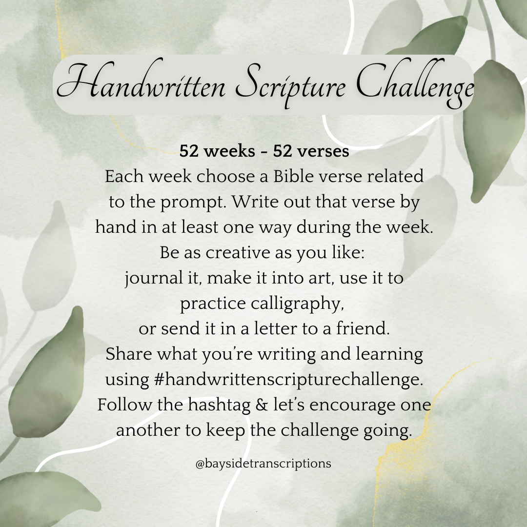 If you’ve followed us on social media, you may have seen the 2025 Handwritten Scripture Challenge. This has been a lot of fun and a very enriching exercise. The challenge is to write out by hand at least one Scripture verse per week based on the given prompt. It’s an opportunity to pause and delve into the Bible in a way that connects us to the words on the page. By exploring particular themes of Scripture and handwriting the verses it plants the meaning all the more deeply in our hearts. Plus, it’s a great way to practice your handwriting or calligraphy skills. Posting your written verses on social media with the hashtag #handwrittenscripturechallenge connects us and we can inspire one another on.